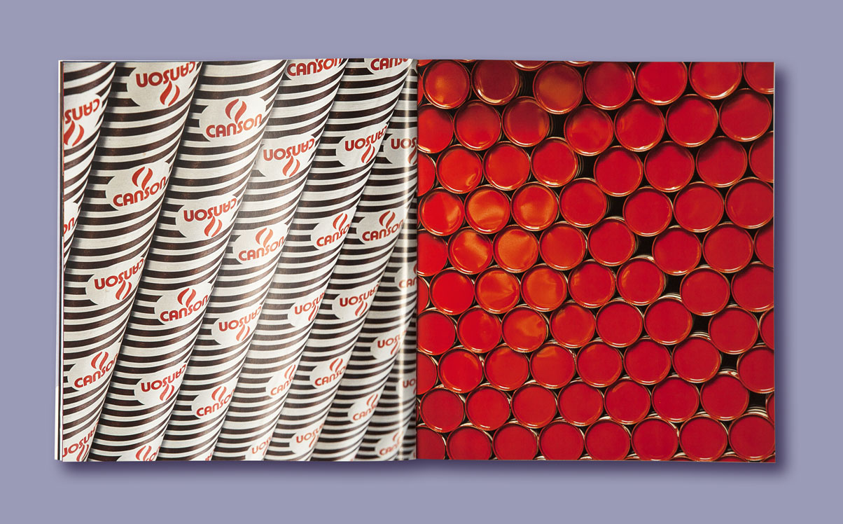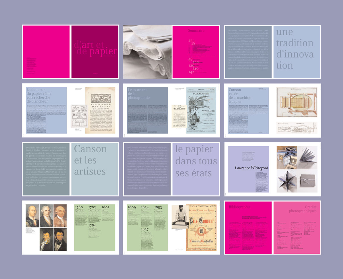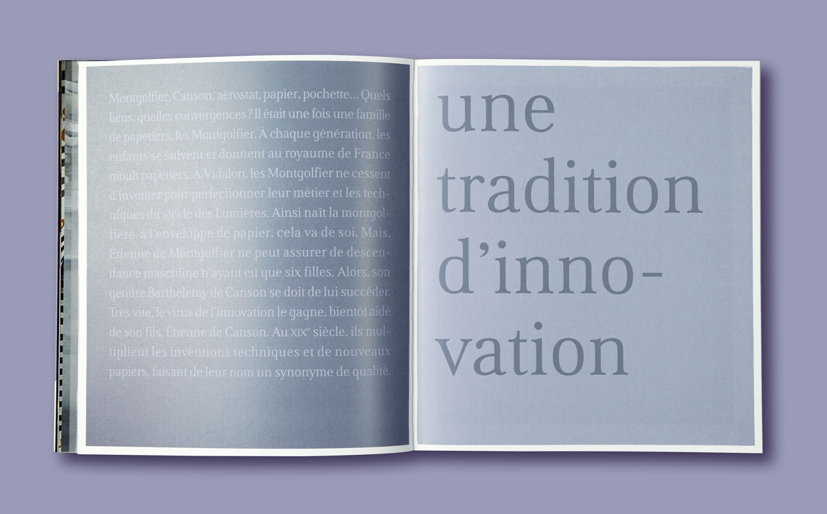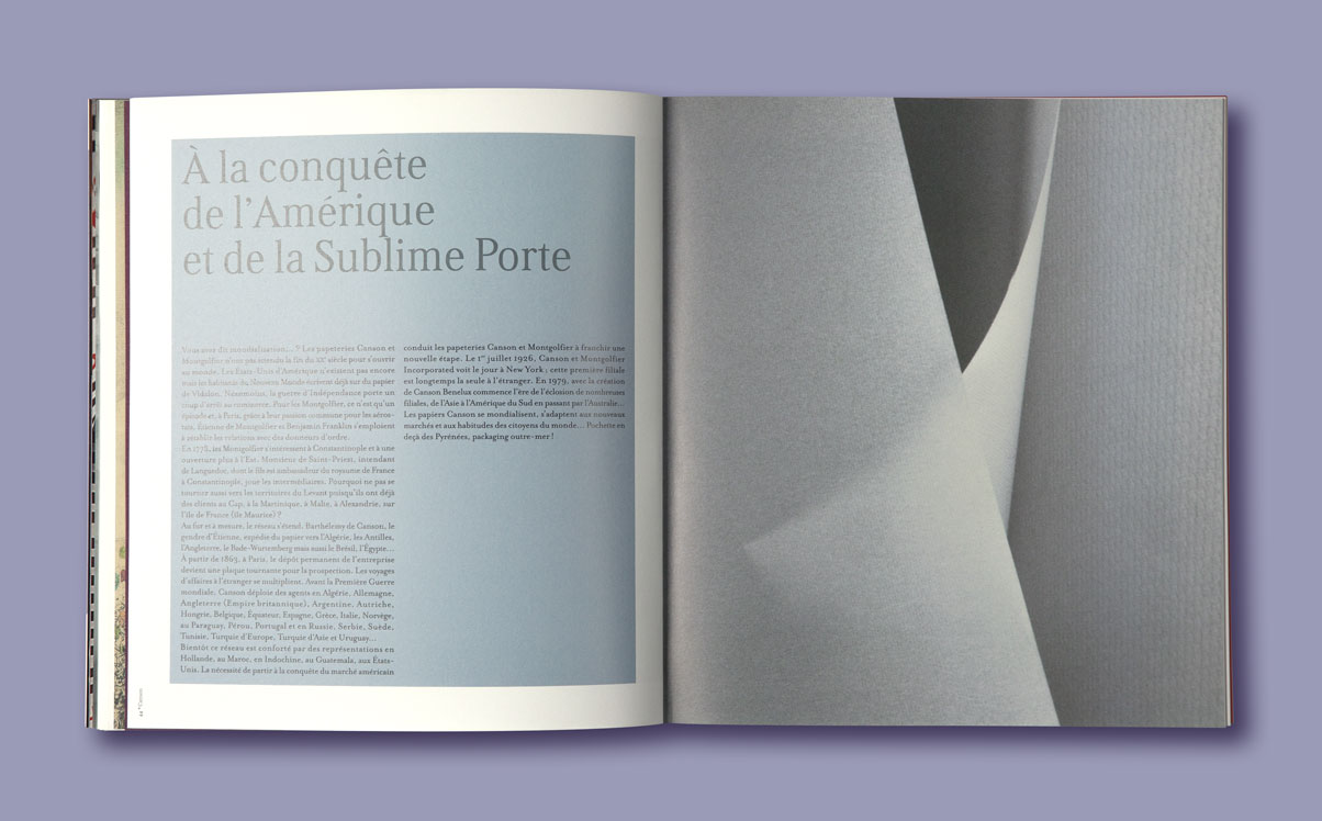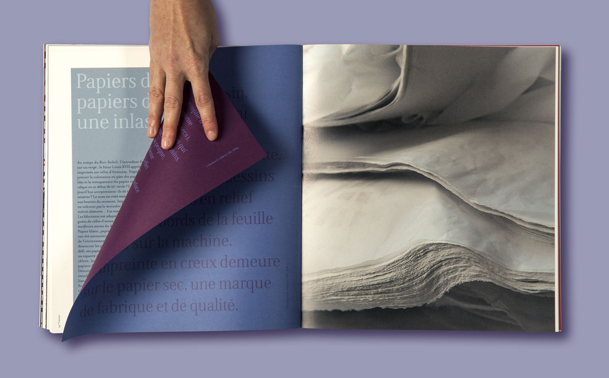 Ce livre, célébrant les 450 ans du mythique papier Canson, se devait d’être une expérience chromatique et tactile. Un cahier photos sur papier couché glossy ouvre le livre, plongeant d’emblée le lecteur dans la fabrication du papier. Tout le reste du livre est conçu à partir de la confrontation d’une gamme subtile de gris colorés, utilisée en aplats dans les différents chapitres, confronté à des couleurs très vives, l’ensemble évoquant les gammes chromatiques du célèbre papier. Des pages typographiques de glossaire, parsemant le livre de façon aléatoire, sont imprimées sur des feuilles de papier Canson d’une seule et même couleur mais en défonce au verso donnant l’illusion qu’elles sont bifaces. Enfin, le travail d’artistes utilisateurs du papier Canson est présenté en face d’une page reprenant la gamme chromatique de l’œuvre qui est présentée.