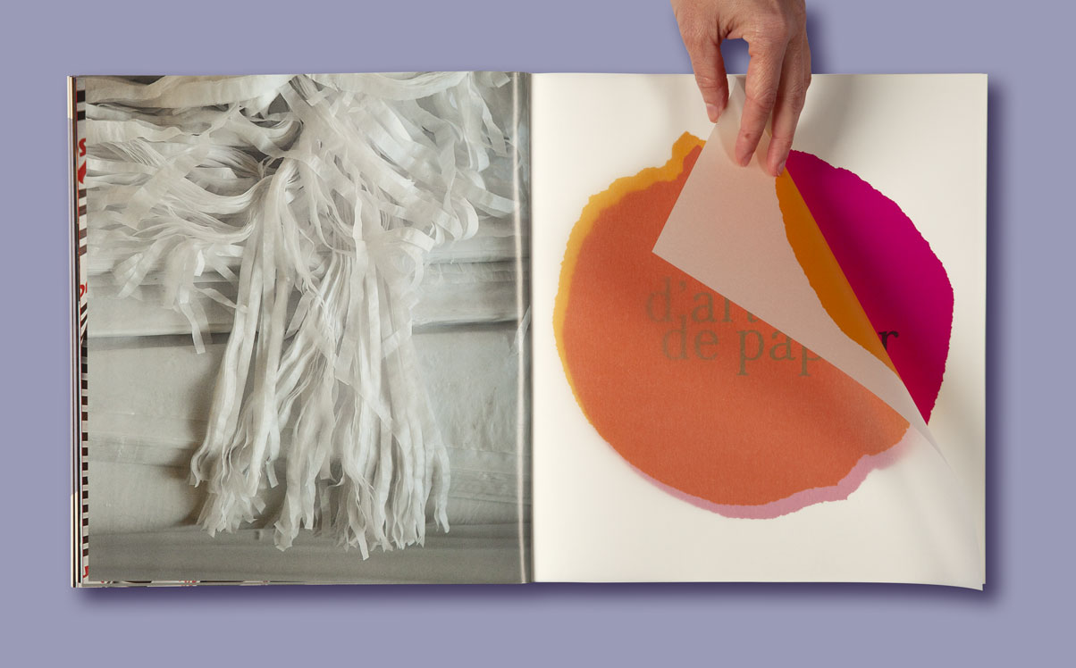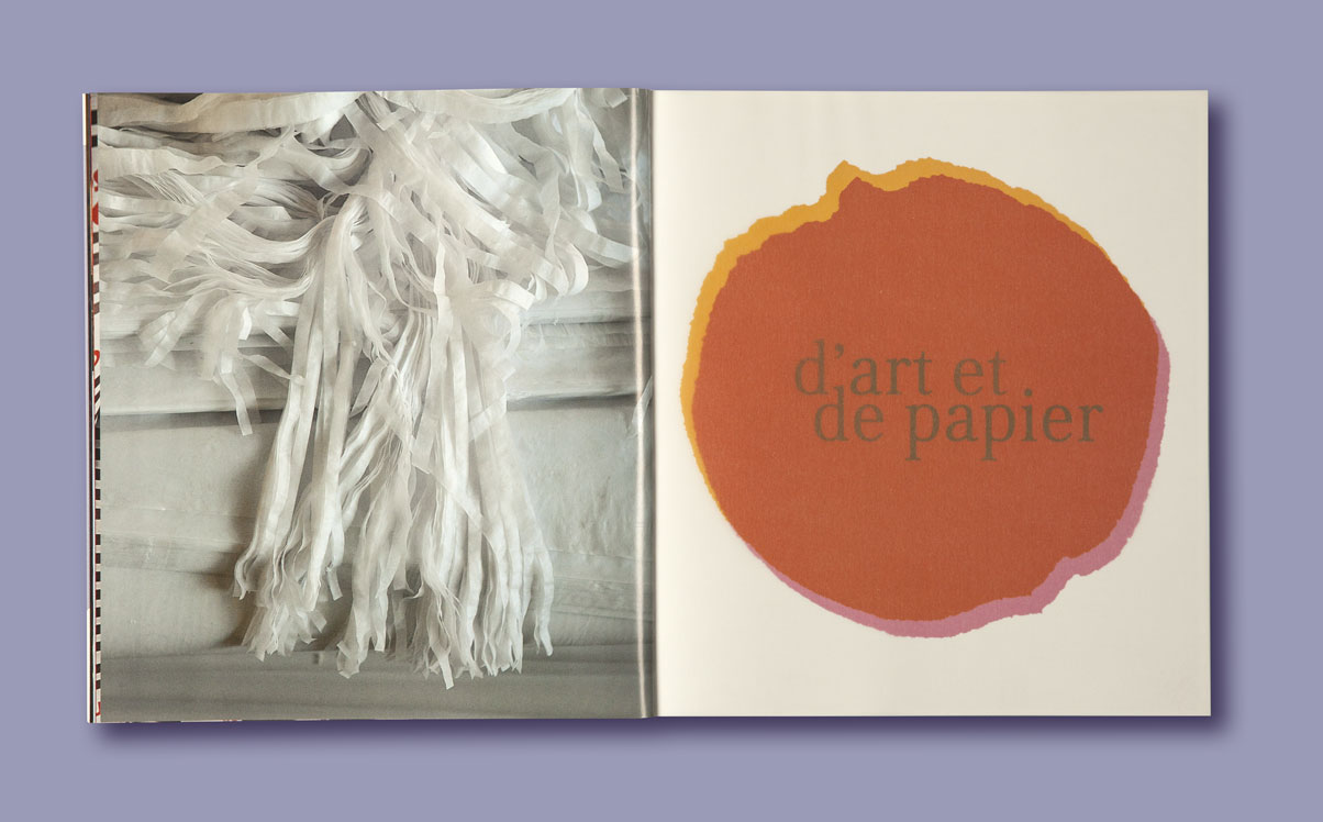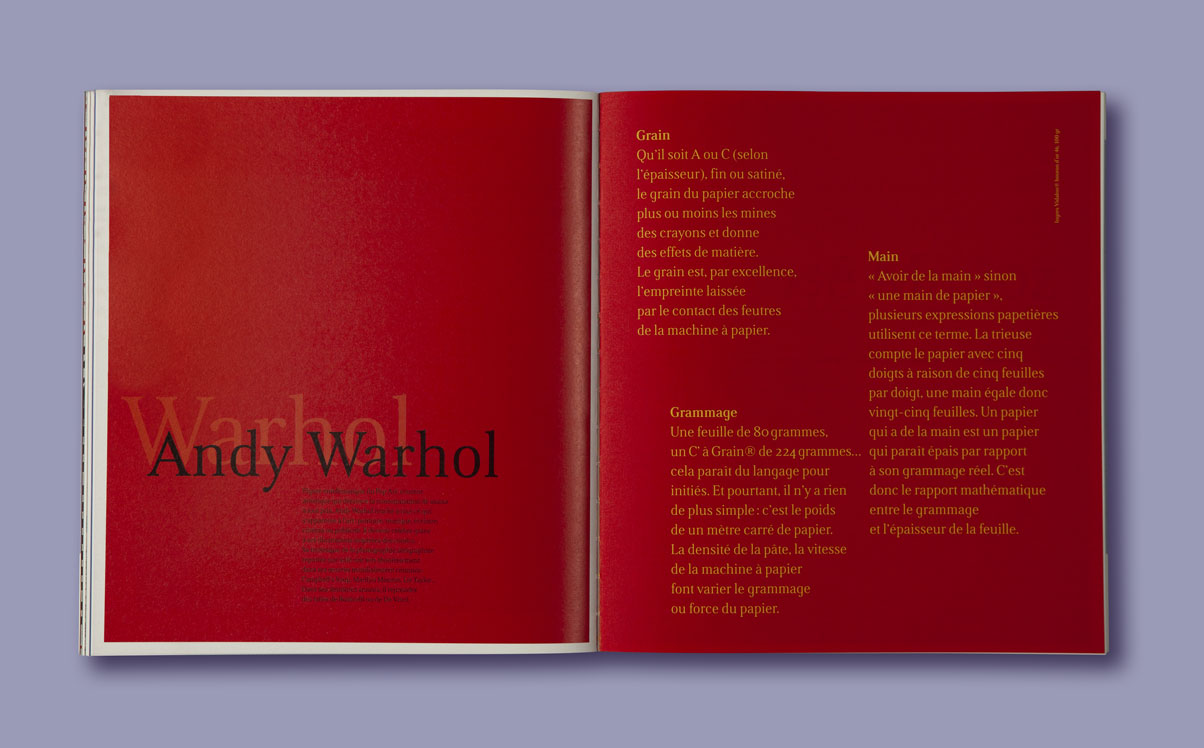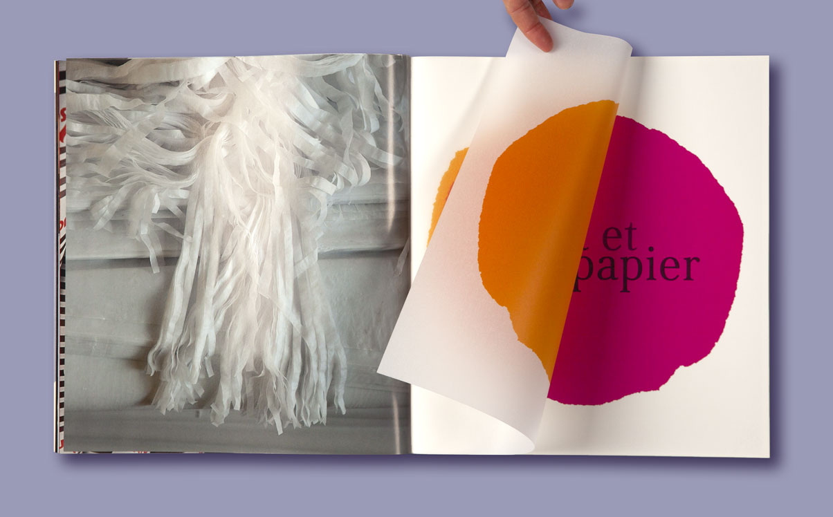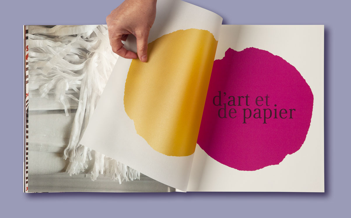 Ce livre, célébrant les 450 ans du mythique papier Canson, se devait d’être une expérience chromatique et tactile. Un cahier photos sur papier couché glossy ouvre le livre, plongeant d’emblée le lecteur dans la fabrication du papier. Tout le reste du livre est conçu à partir de la confrontation d’une gamme subtile de gris colorés, utilisée en aplats dans les différents chapitres, confronté à des couleurs très vives, l’ensemble évoquant les gammes chromatiques du célèbre papier. Des pages typographiques de glossaire, parsemant le livre de façon aléatoire, sont imprimées sur des feuilles de papier Canson d’une seule et même couleur mais en défonce au verso donnant l’illusion qu’elles sont bifaces. Enfin, le travail d’artistes utilisateurs du papier Canson est présenté en face d’une page reprenant la gamme chromatique de l’œuvre qui est présentée.