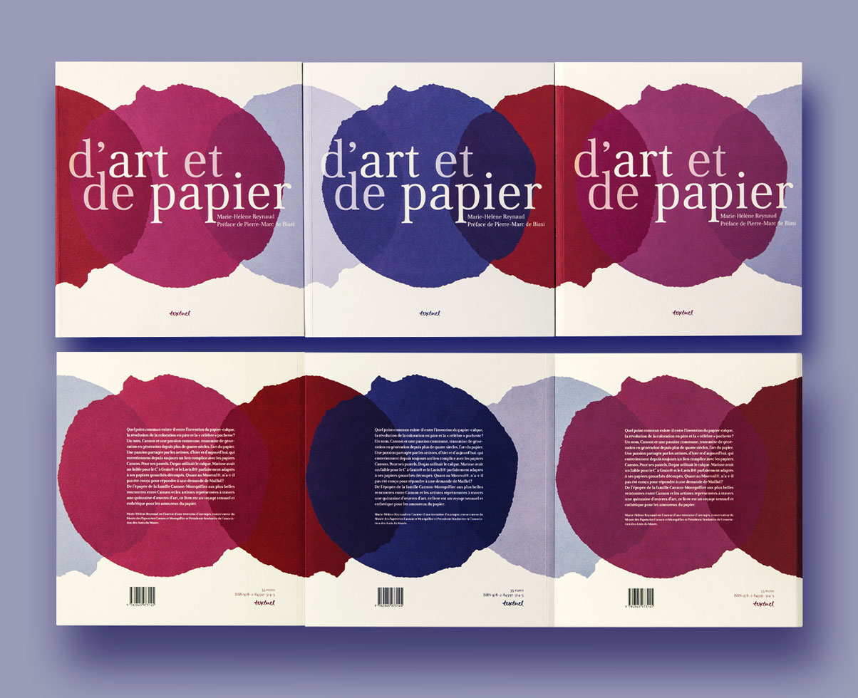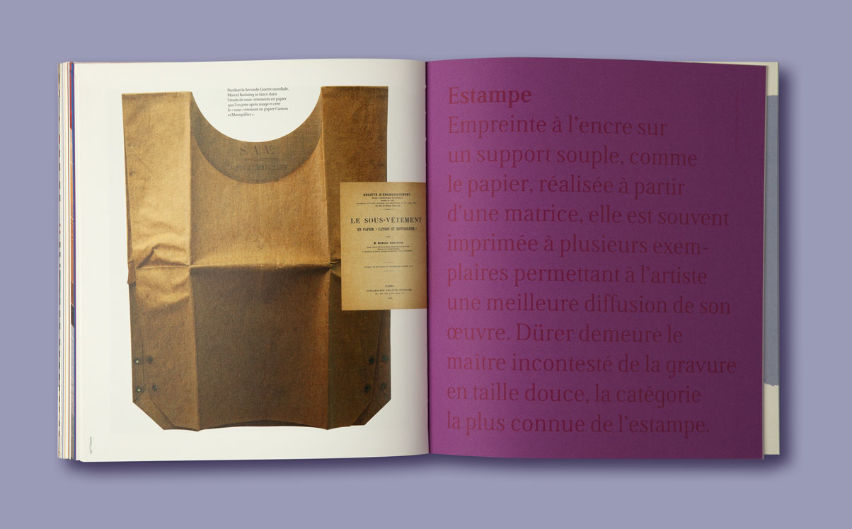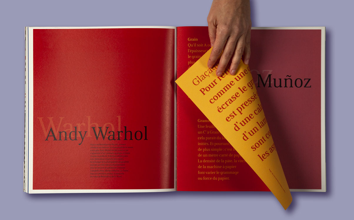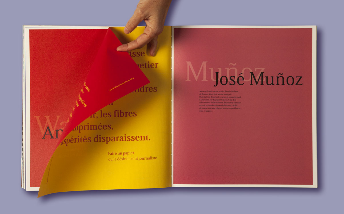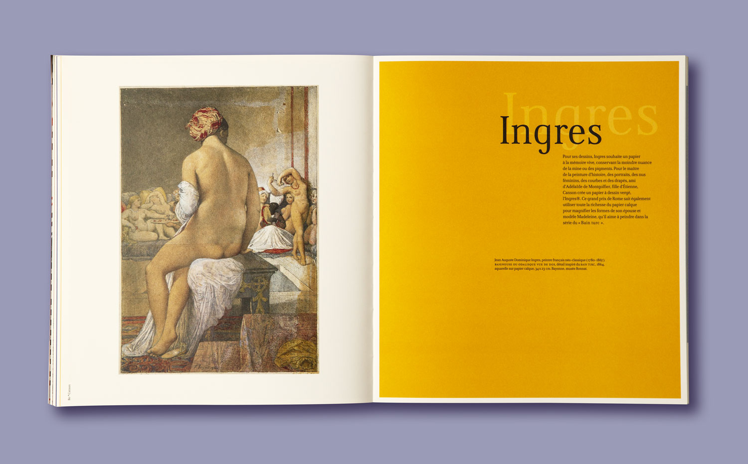 Ce livre, célébrant les 450 ans du mythique papier Canson, se devait d’être une expérience chromatique et tactile. Un cahier photos sur papier couché glossy ouvre le livre, plongeant d’emblée le lecteur dans la fabrication du papier. Tout le reste du livre est conçu à partir de la confrontation d’une gamme subtile de gris colorés, utilisée en aplats dans les différents chapitres, confronté à des couleurs très vives, l’ensemble évoquant les gammes chromatiques du célèbre papier. Des pages typographiques de glossaire, parsemant le livre de façon aléatoire, sont imprimées sur des feuilles de papier Canson d’une seule et même couleur mais en défonce au verso donnant l’illusion qu’elles sont bifaces. Enfin, le travail d’artistes utilisateurs du papier Canson est présenté en face d’une page reprenant la gamme chromatique de l’œuvre qui est présentée.