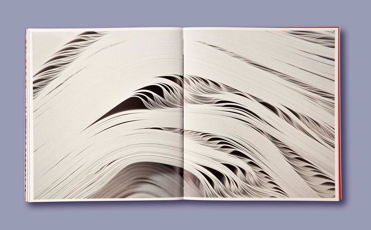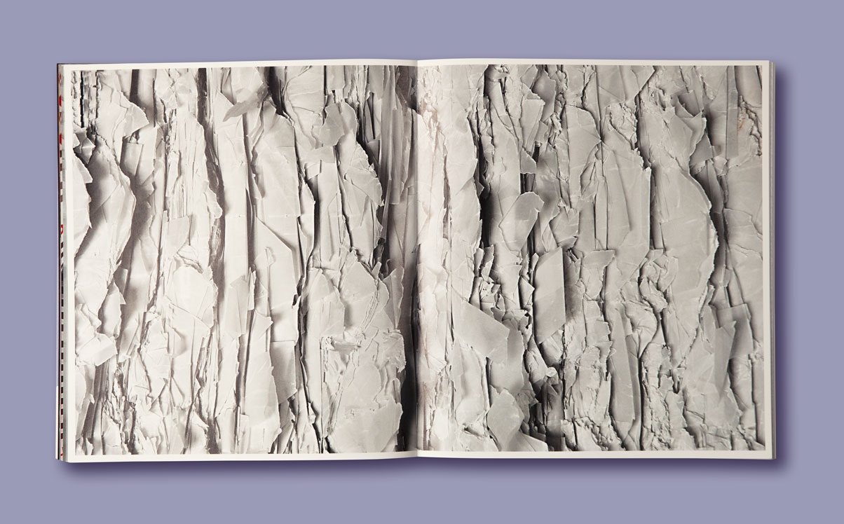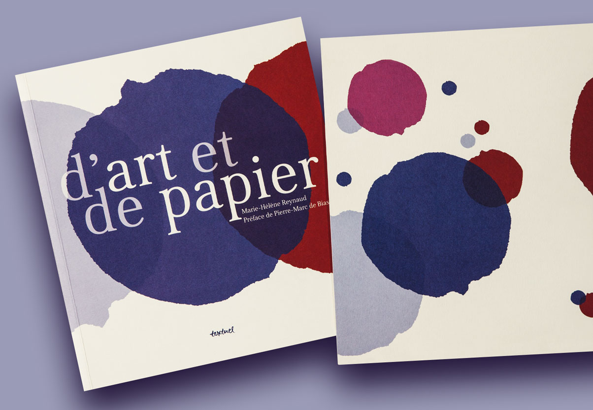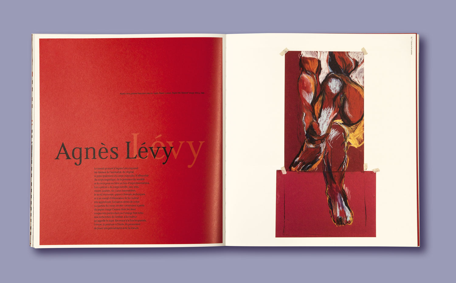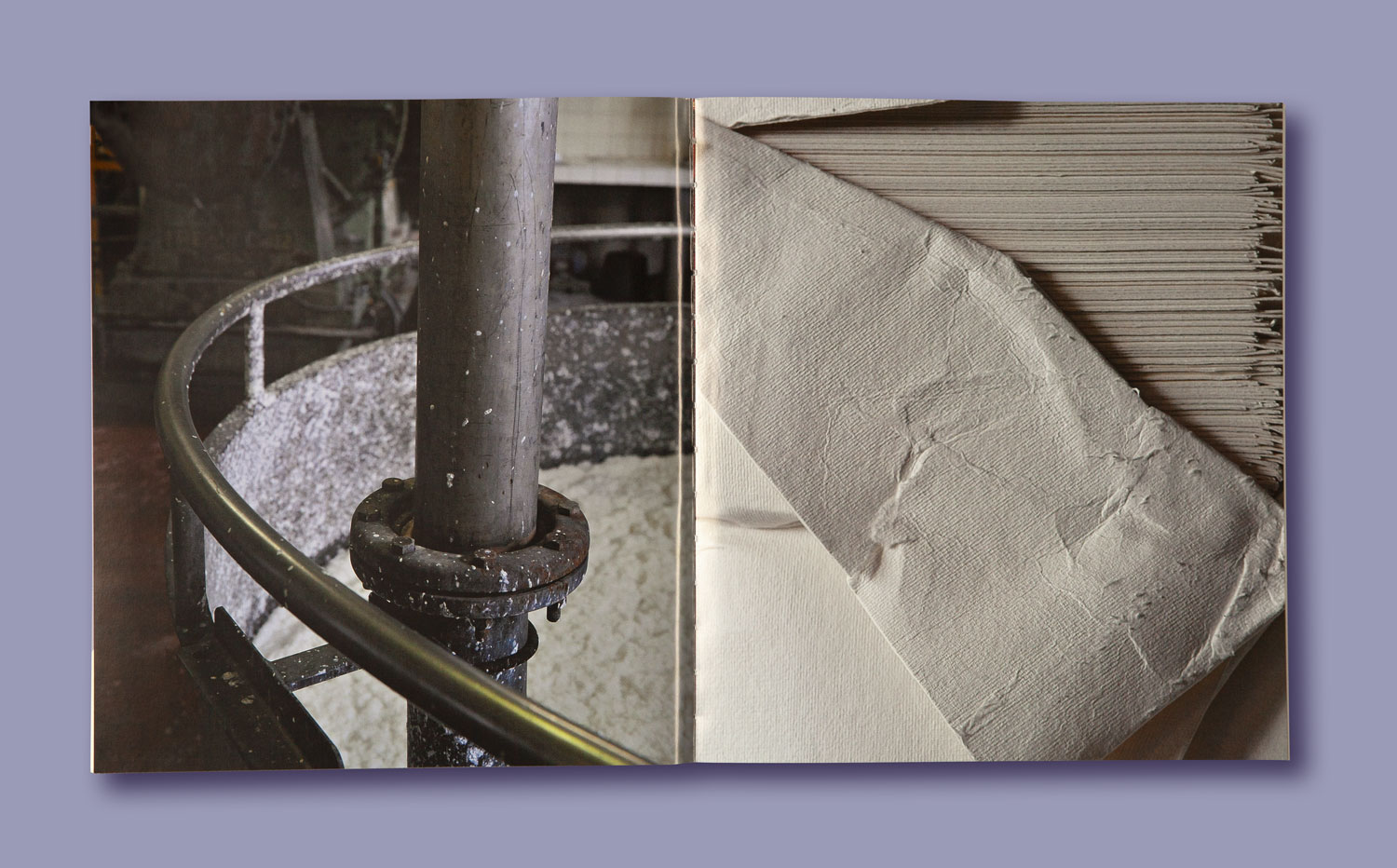 Ce livre, célébrant les 450 ans du mythique papier Canson, se devait d’être une expérience chromatique et tactile. Un cahier photos sur papier couché glossy ouvre le livre, plongeant d’emblée le lecteur dans la fabrication du papier. Tout le reste du livre est conçu à partir de la confrontation d’une gamme subtile de gris colorés, utilisée en aplats dans les différents chapitres, confronté à des couleurs très vives, l’ensemble évoquant les gammes chromatiques du célèbre papier. Des pages typographiques de glossaire, parsemant le livre de façon aléatoire, sont imprimées sur des feuilles de papier Canson d’une seule et même couleur mais en défonce au verso donnant l’illusion qu’elles sont bifaces. Enfin, le travail d’artistes utilisateurs du papier Canson est présenté en face d’une page reprenant la gamme chromatique de l’œuvre qui est présentée.