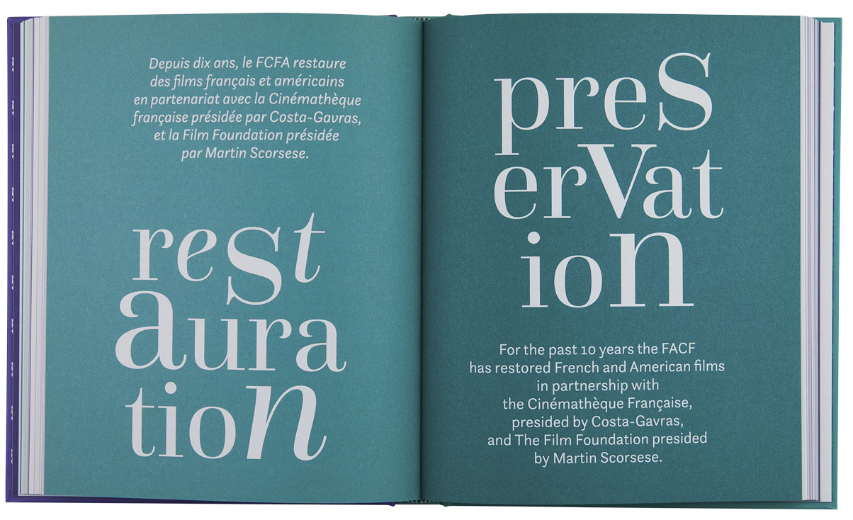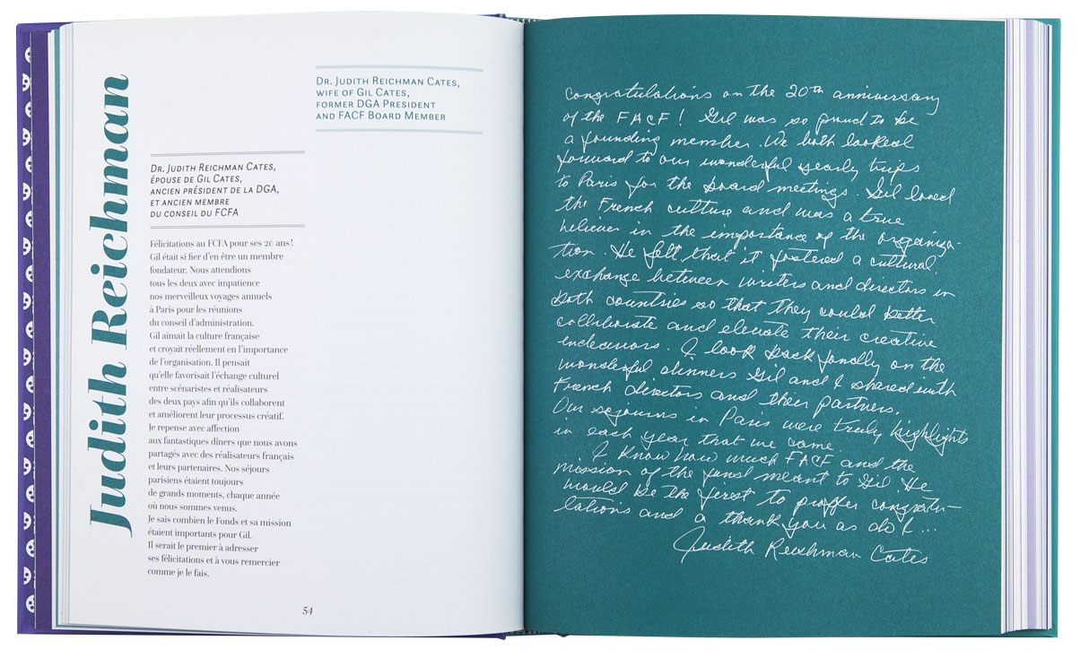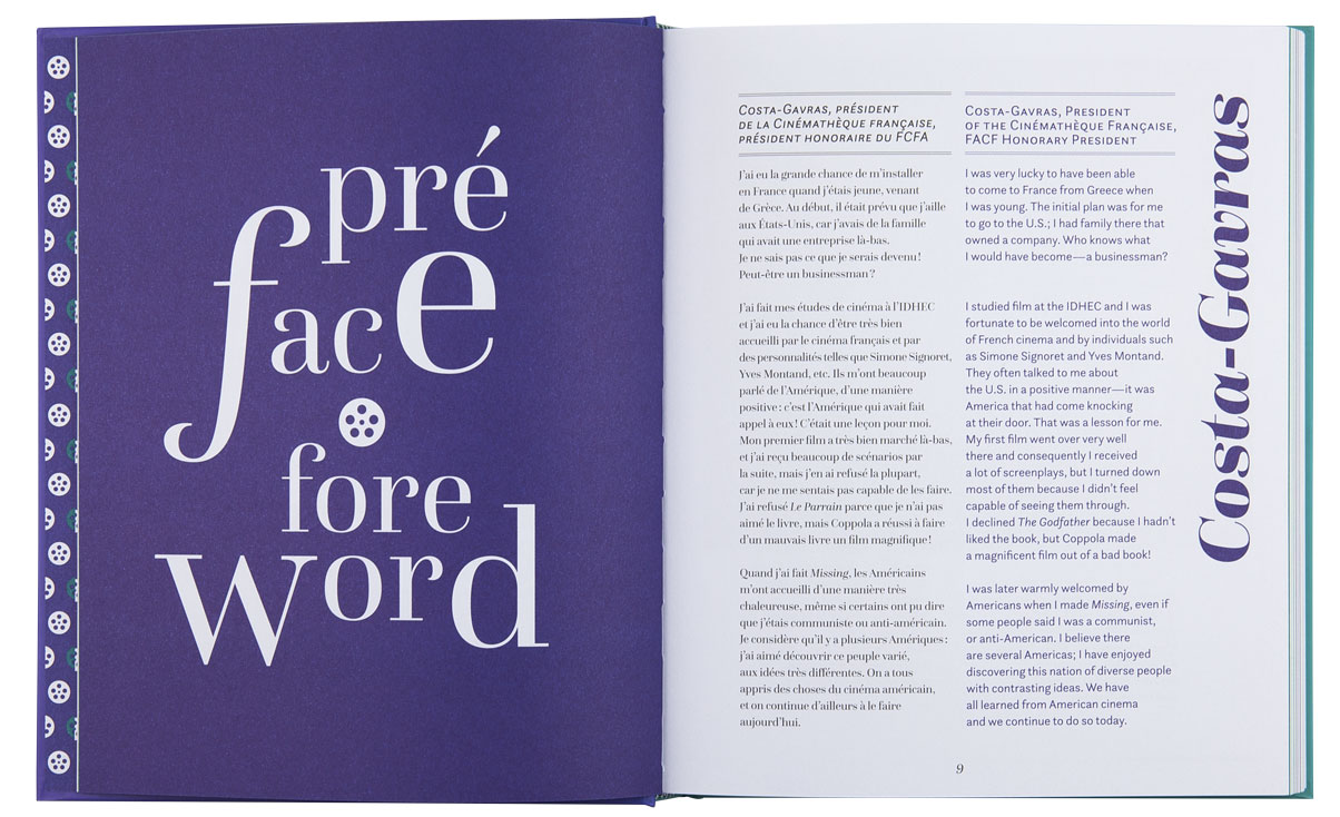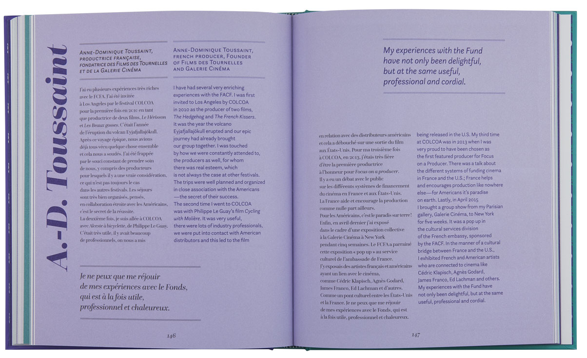 Cet ouvrage bilingue a été réalisé à l’occasion des vingt ans du Fond culturel franco américain, organisme dont l’objectif est l’amélioration et l’expansion de la communication et de l’échange culturel entre les créateurs et entre les industries en France et aux Etats-Unis. De cette collaboration sont nés le festival COLCOA, des Universités d’été, des rencontres franco-américaines, un fond de restauration de films…