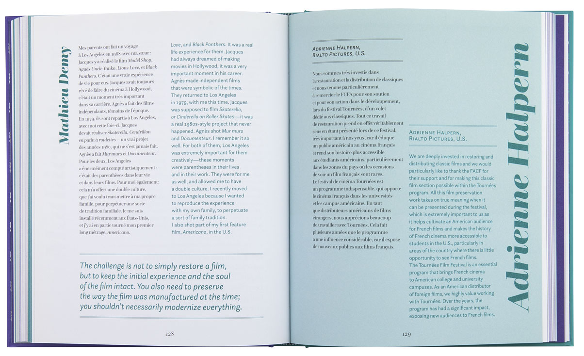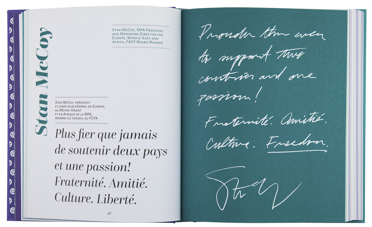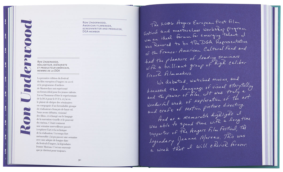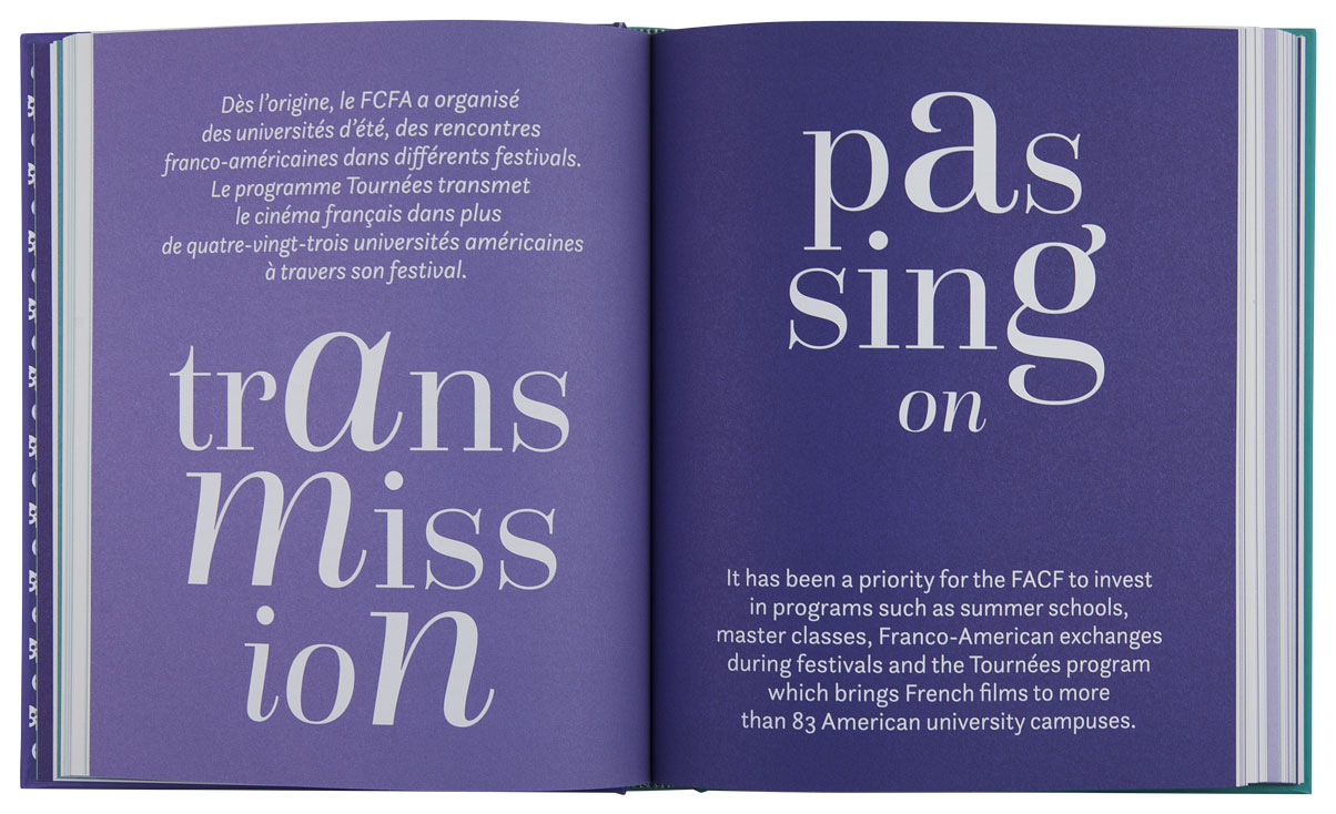 Cet ouvrage bilingue a été réalisé à l’occasion des vingt ans du Fond culturel franco américain, organisme dont l’objectif est l’amélioration et l’expansion de la communication et de l’échange culturel entre les créateurs et entre les industries en France et aux Etats-Unis. De cette collaboration sont nés le festival COLCOA, des Universités d’été, des rencontres franco-américaines, un fond de restauration de films…