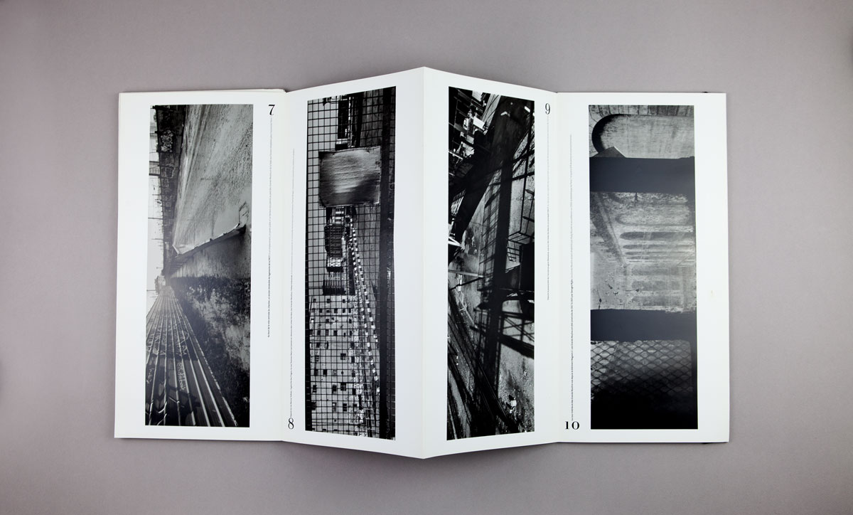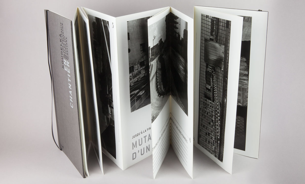 Le premier photographe a être sollicité étant Joseph Koudelka, c’est d’abord à ses grands formats horizontaux de prédilection que la forme du livre s’est adaptée. La forme du leporello offre au lecteur la possibilité de déplier le livre pour voir d’un seul coup d’œil l’ensemble des photos ou de tourner une à une chaque page.