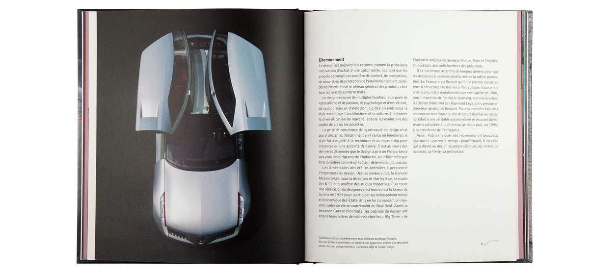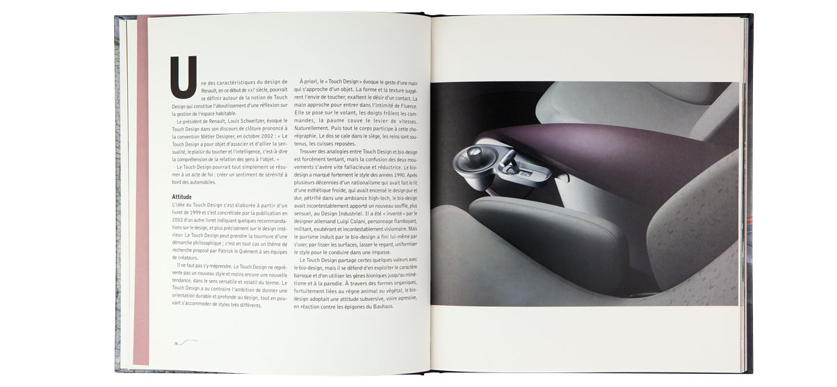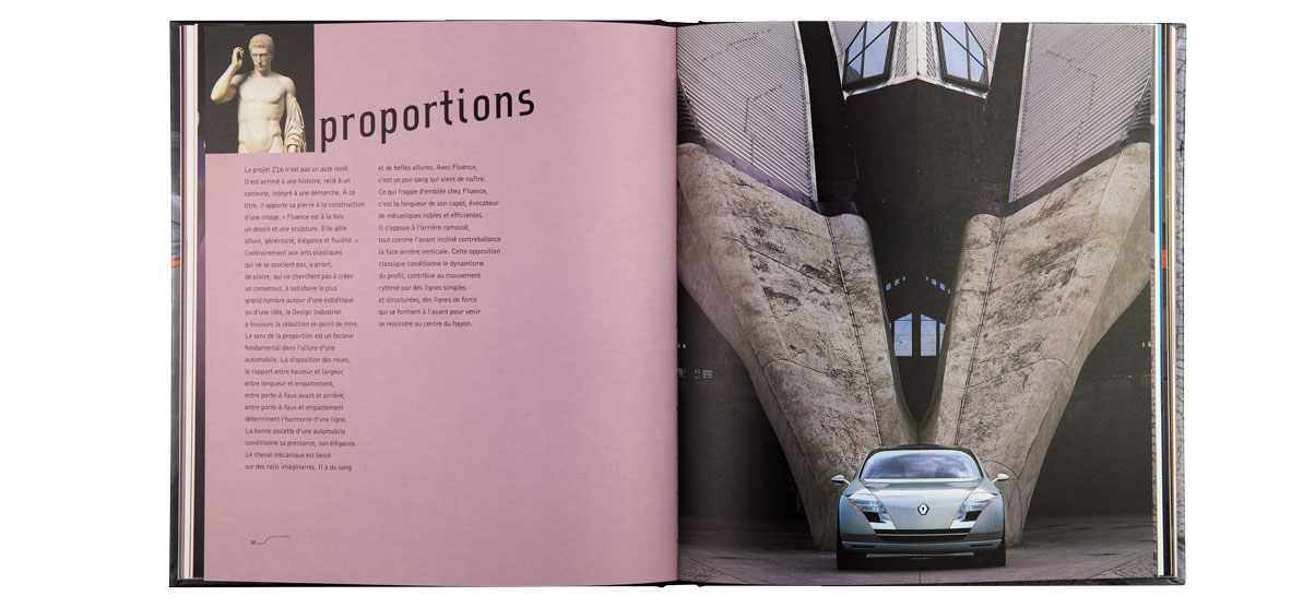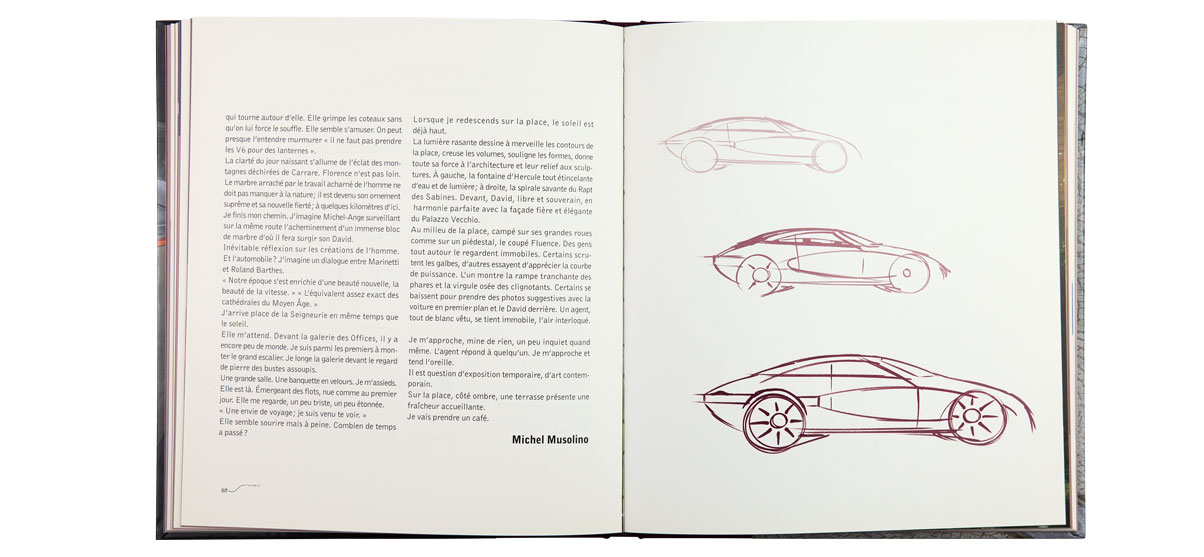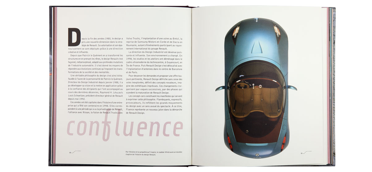 Le livre dévoile le design du concept-car Fluence de Renault. Des inspirations aux premiers croquis, des moindres détails de fabrication et de design jusqu’aux courbes élégantes de la voiture achevée. Le livre a deux entrées: l’une au recto révélant la création de Fluence, l’autre au verso sur les coulisses de la création.