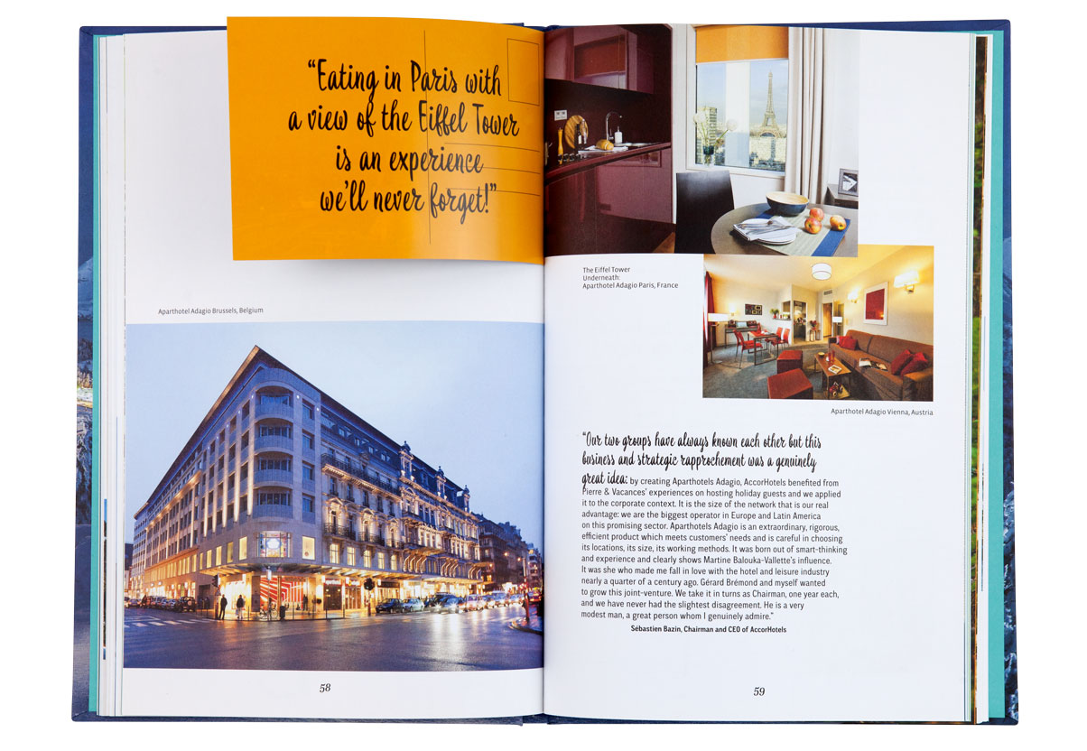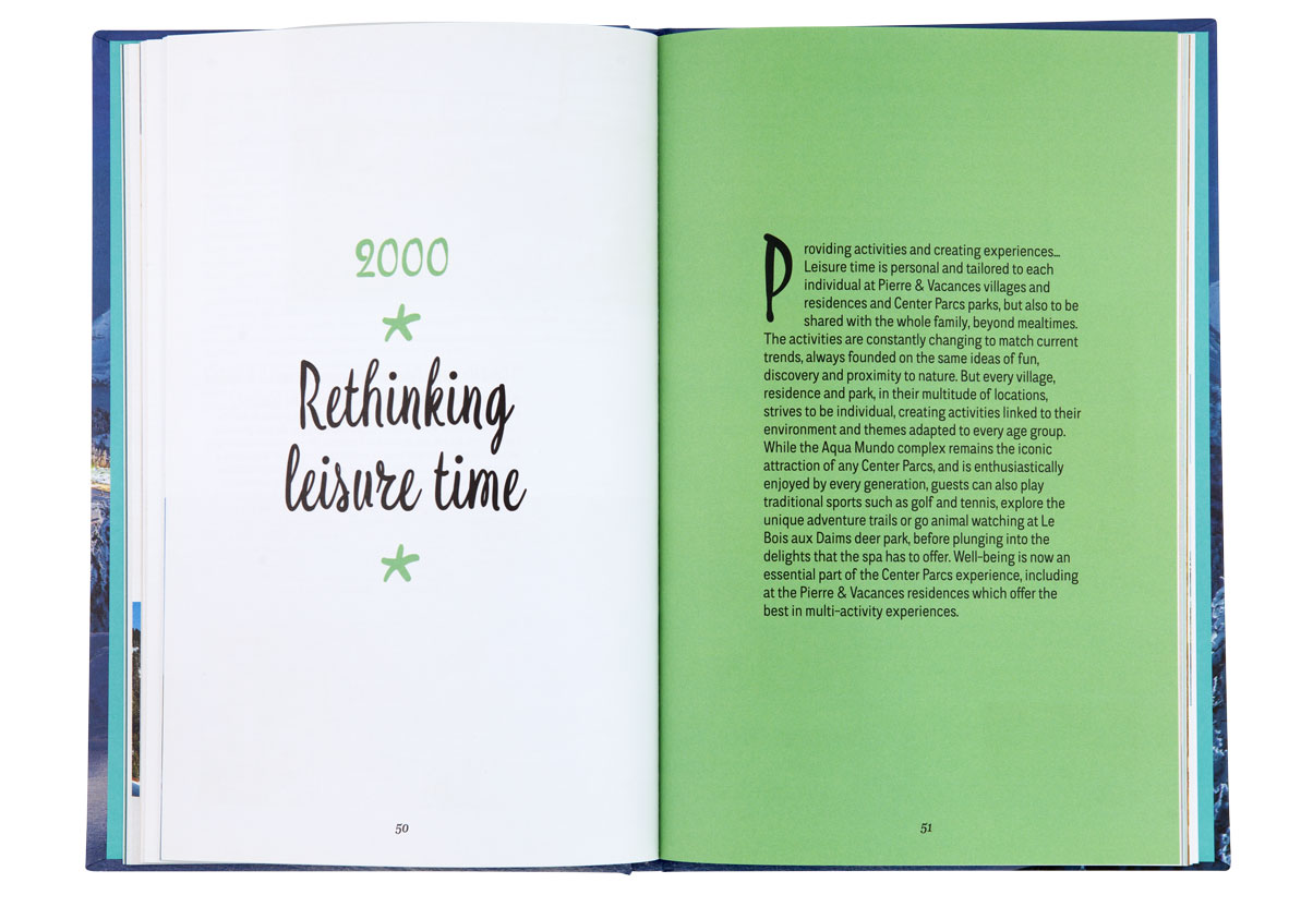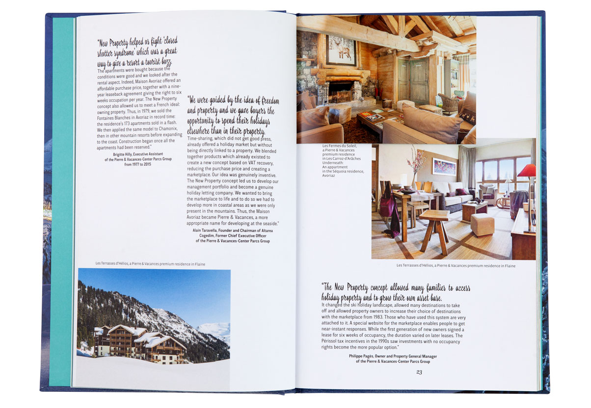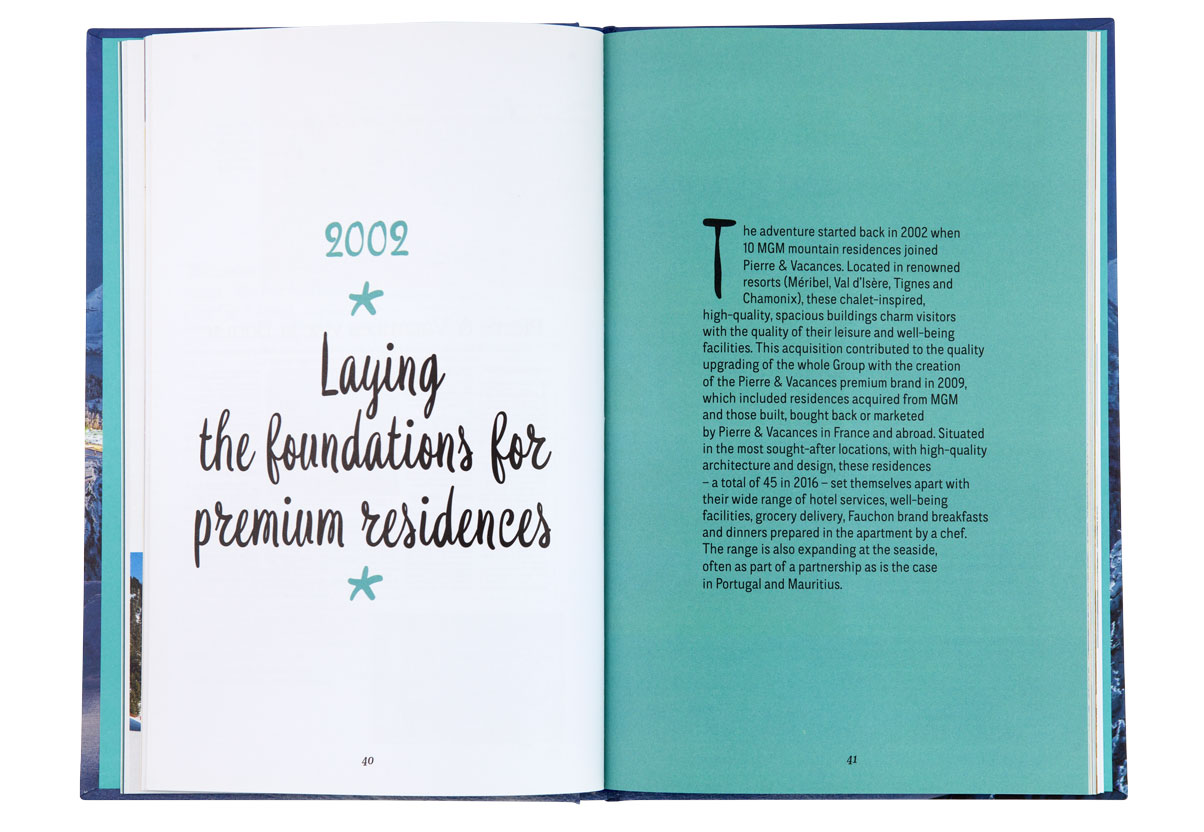 Le livre reconstitue l’histoire audacieuse de Pierre et Vacances à travers la redécouverte de ses lieux les plus emblématiques et jusqu’à ses plus récents projets. Un sytème d’encarts sous forme de cartes postales ponctue les pages et créé un jeu sur le dedans et le dehors. Une invitation à partir en vacances, à la montagne, à la mer, ou encore dans un bel hôtel…