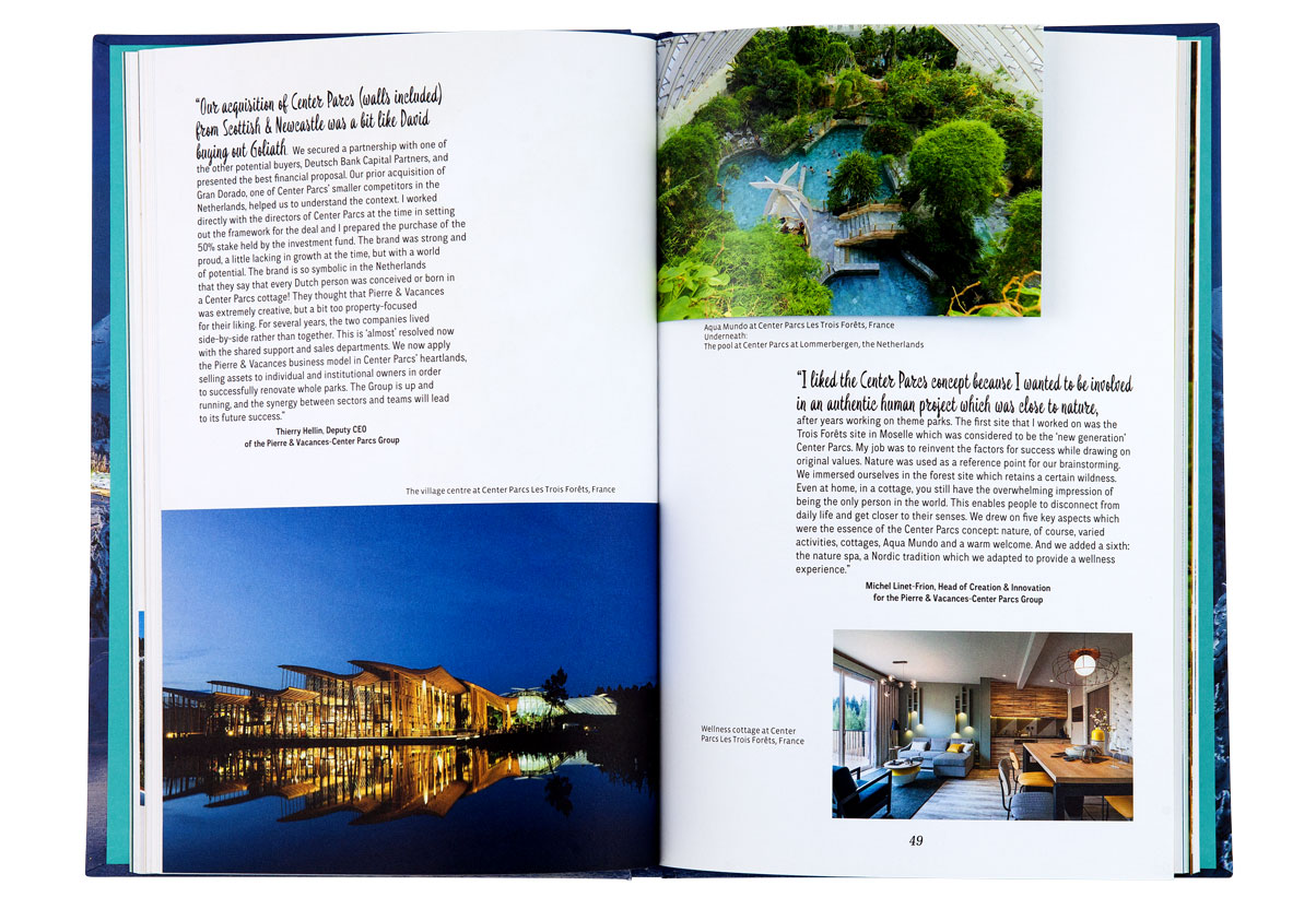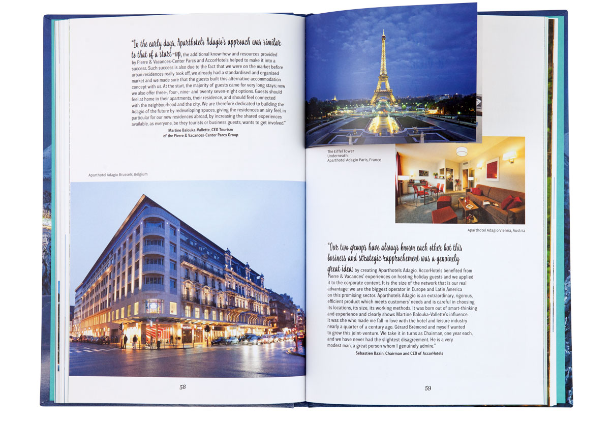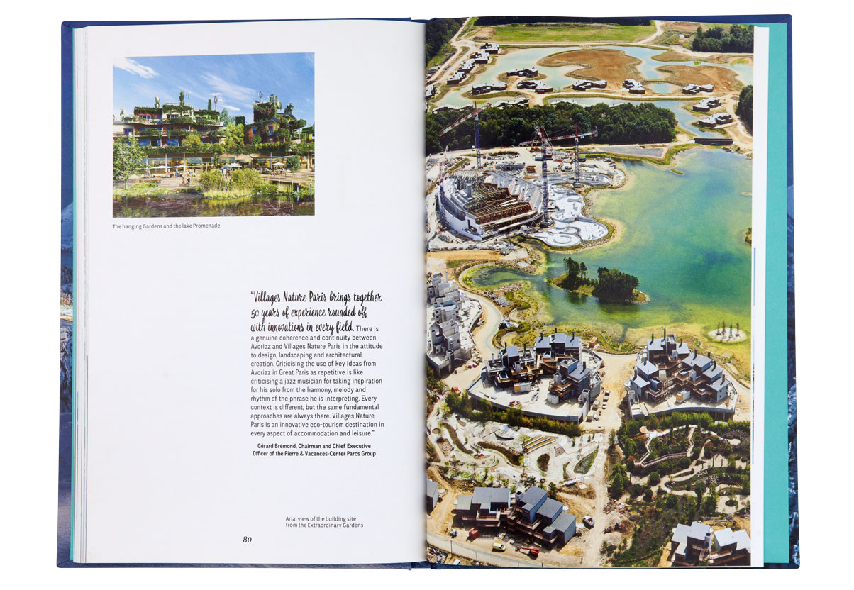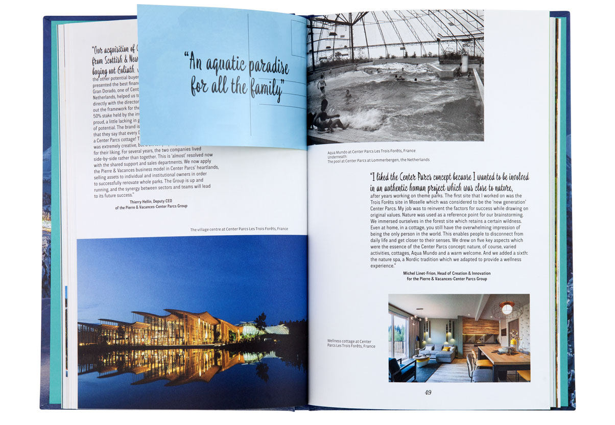 Le livre reconstitue l’histoire audacieuse de Pierre et Vacances à travers la redécouverte de ses lieux les plus emblématiques et jusqu’à ses plus récents projets. Un sytème d’encarts sous forme de cartes postales ponctue les pages et créé un jeu sur le dedans et le dehors. Une invitation à partir en vacances, à la montagne, à la mer, ou encore dans un bel hôtel…
