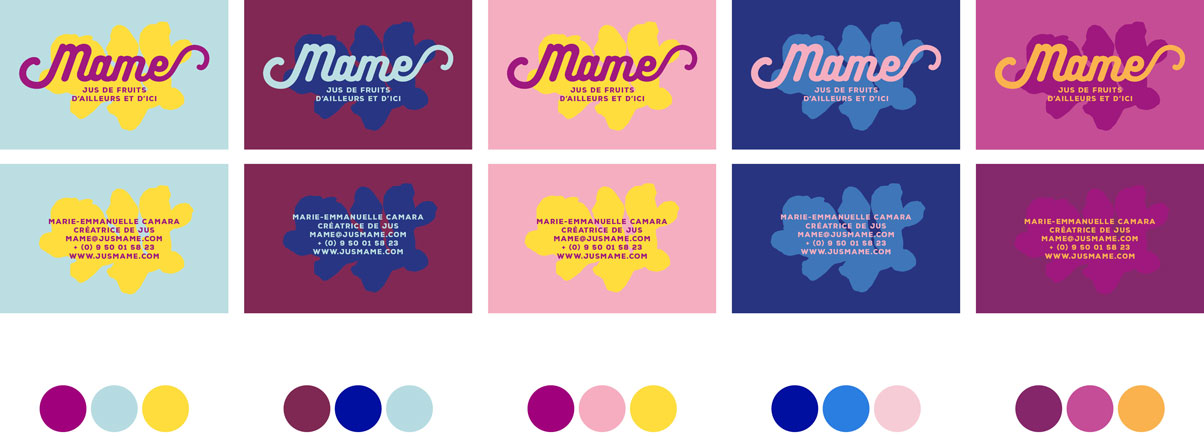 projet Identité visuelle de Mame, fabriquant de fruits exotiques : cartes de visite, étiquettes des bouteilles, petits livrets de présentation… • Design graphique • Illustrations