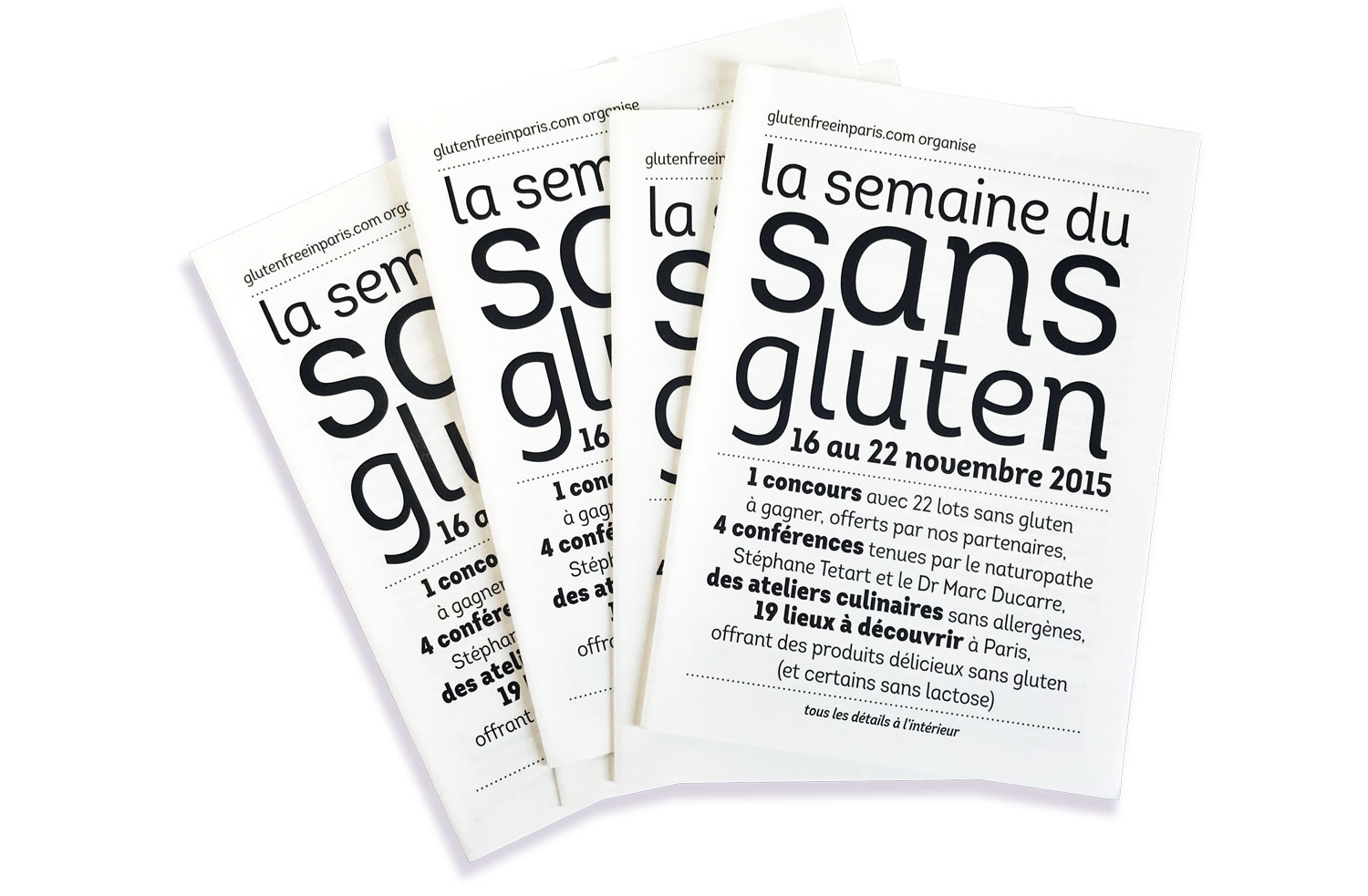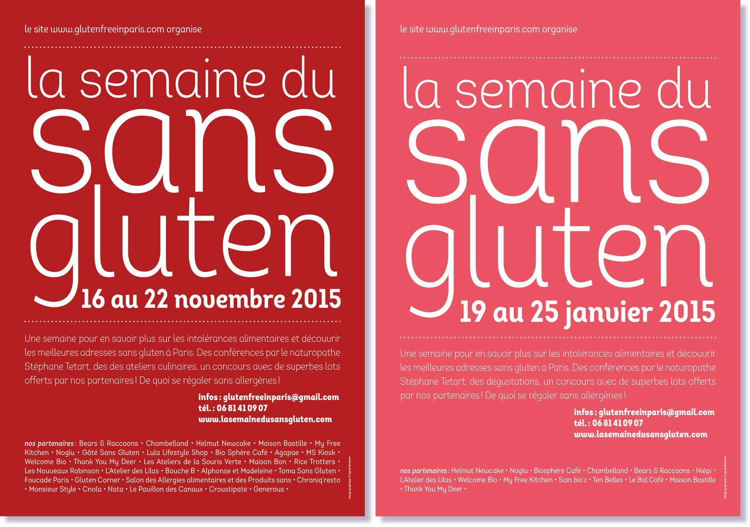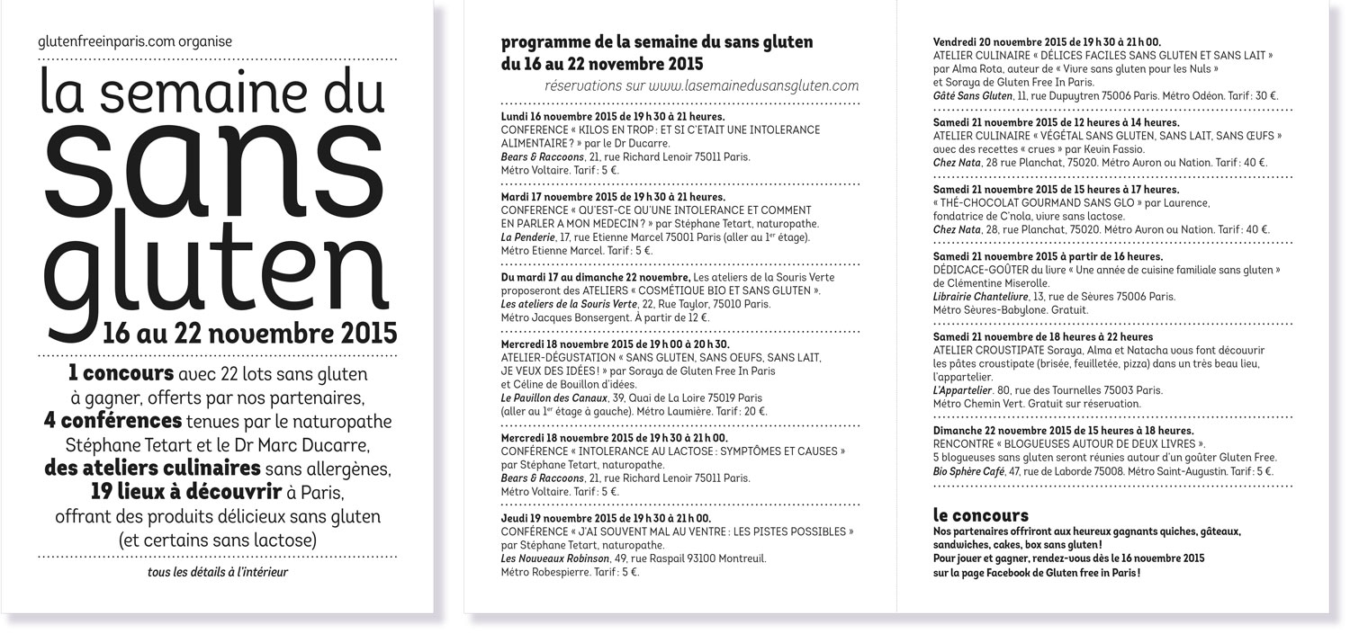 La semaine du sans gluten est un évènement visant à présenter une autre façon de faire la cuisine, bannissant l’austérité des régimes et proposant des mets gourmands malgré les intolérances alimentaires. Elle propose aussi de découvrir les meilleures adresses spécialisées dans toute la France. Les affiches et leurs déclinaisons, principalement typographiques, sont déclinées dans une gamme de couleurs qui met l’eau à la bouche.