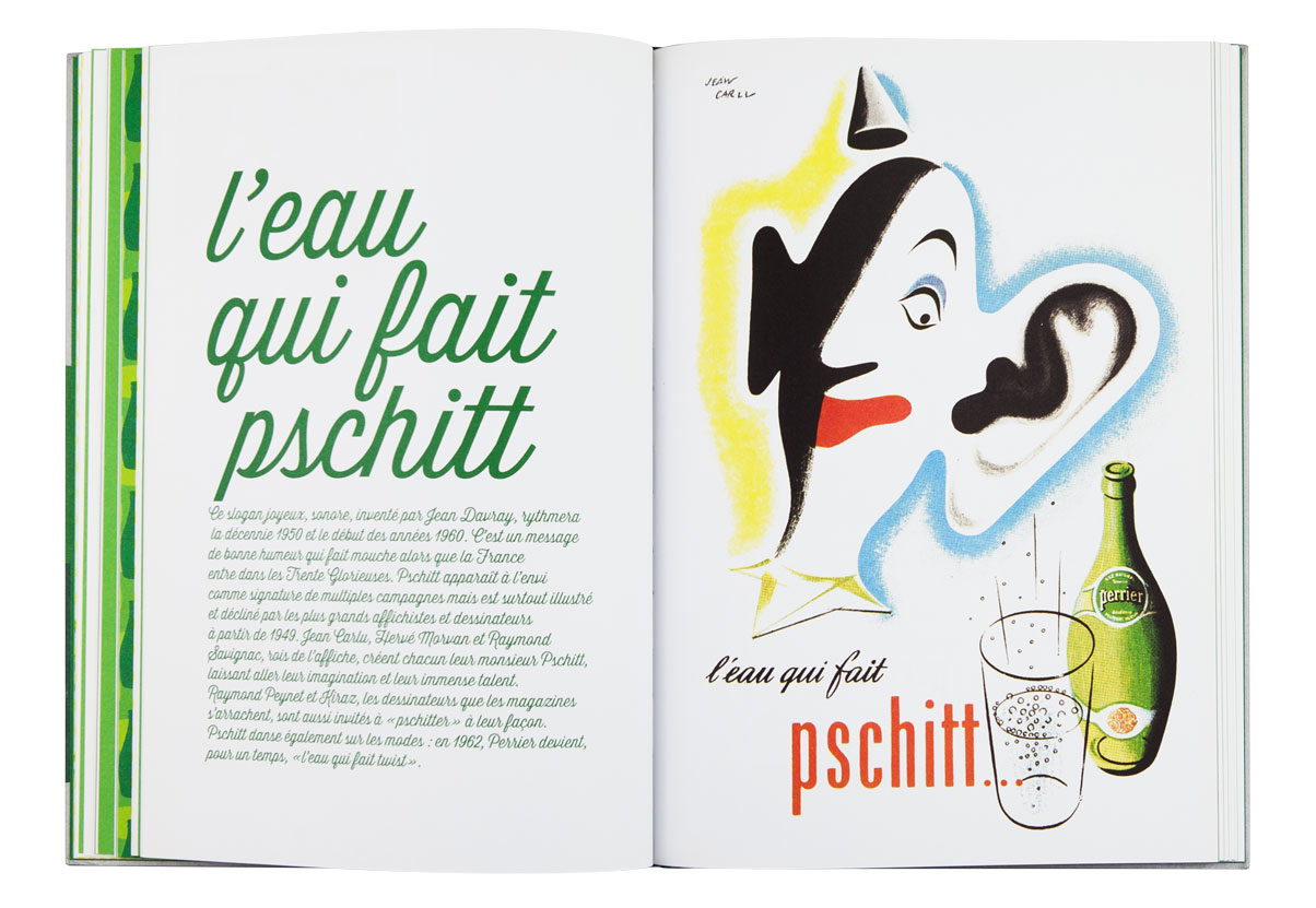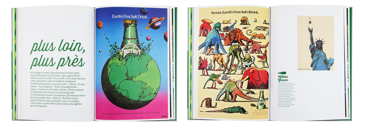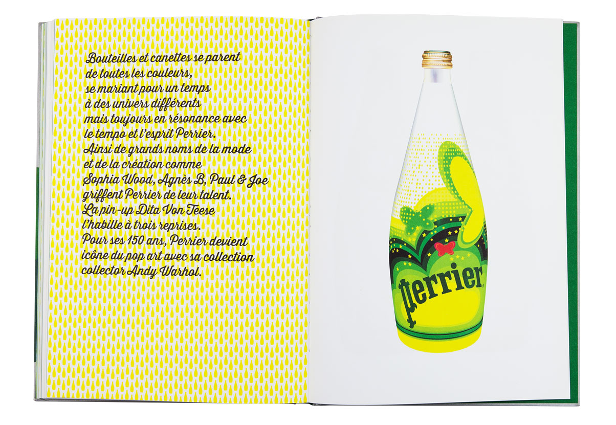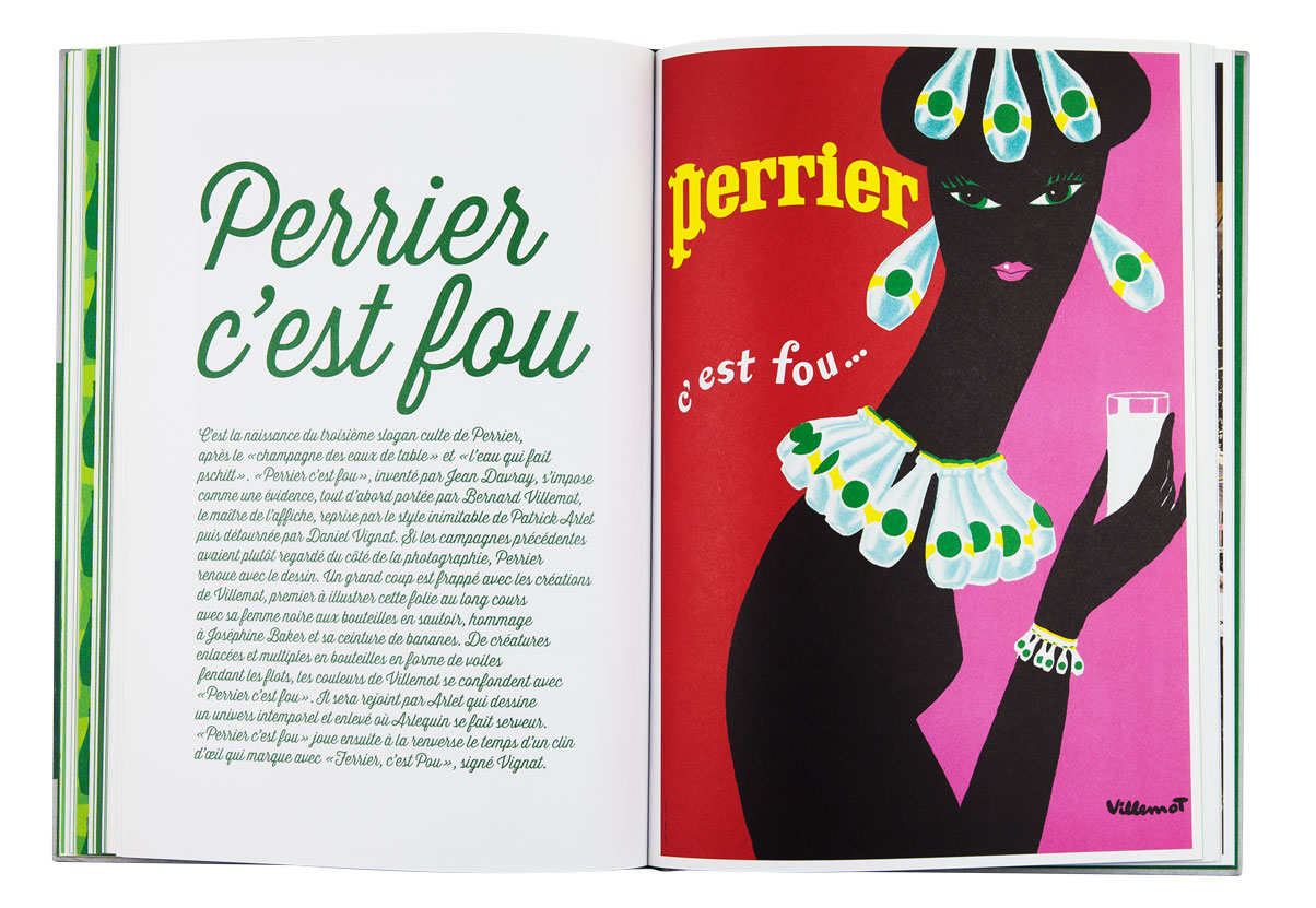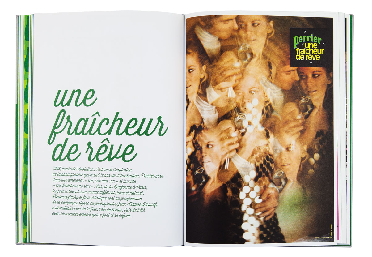 La célèbre eau gazeuse fête ses 150 ans. Elle a été magnifiée par les plus grands affichistes, mis en scène par des créateurs à l’imagination débridée. Cet ouvrage revient à la source, puisant à l’origine de Perrier pour raconter les racines de cette créativité et présente une rétrospective des plus belles affiches et autres campagnes cultes. Les slogans sont autant mis en valeur que les images de façon qu’au feuilletage, ils fonctionnent comme un “inventaire à la Prévert” plein d’humour et de poésie. Une frise de petites bouteilles à la forme si reconnaissable ponctue l’ensemble du livre et se décline, comme les pages, dans un dégradé de verts. L’ensemble créé un livre frais et ludique.