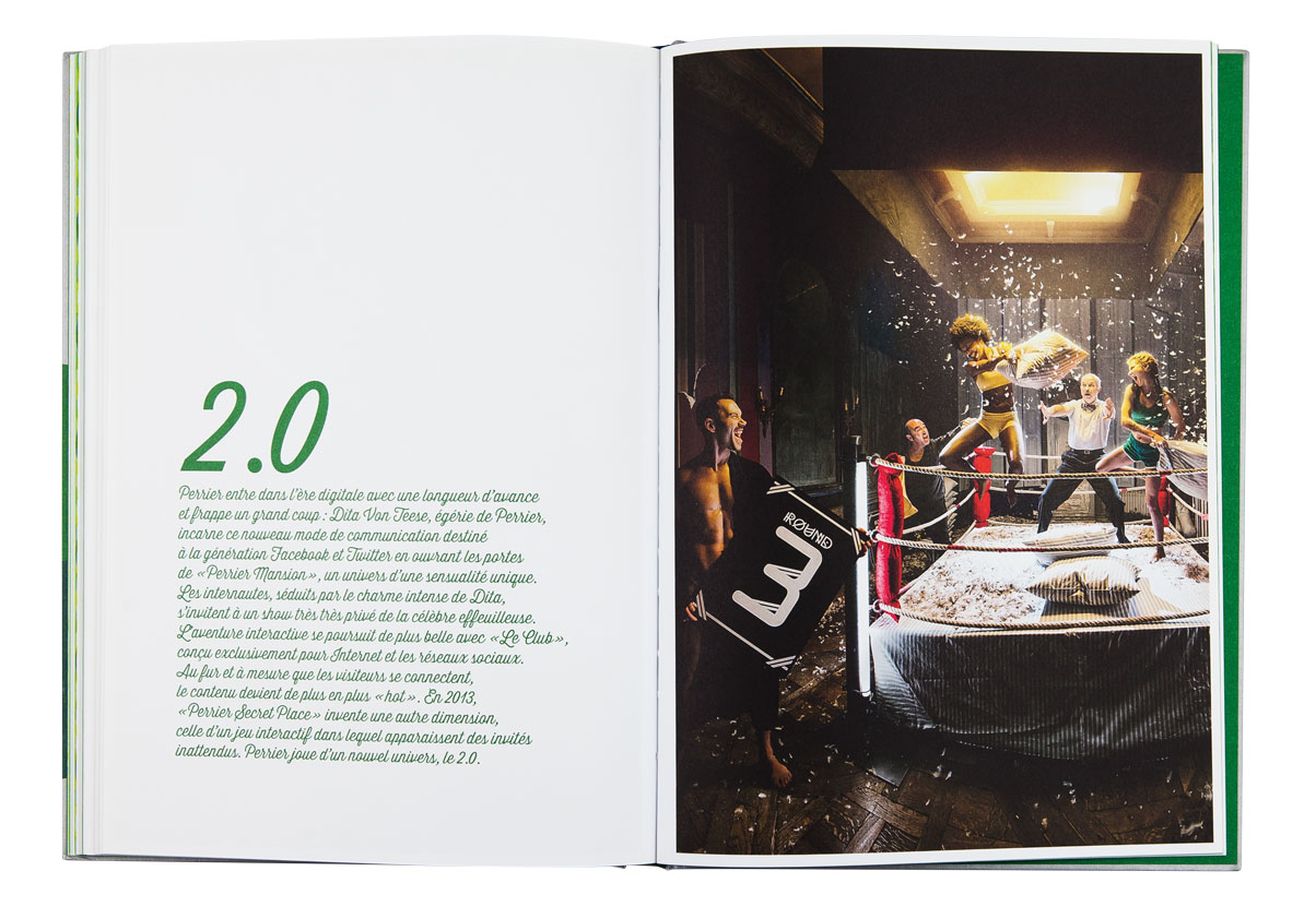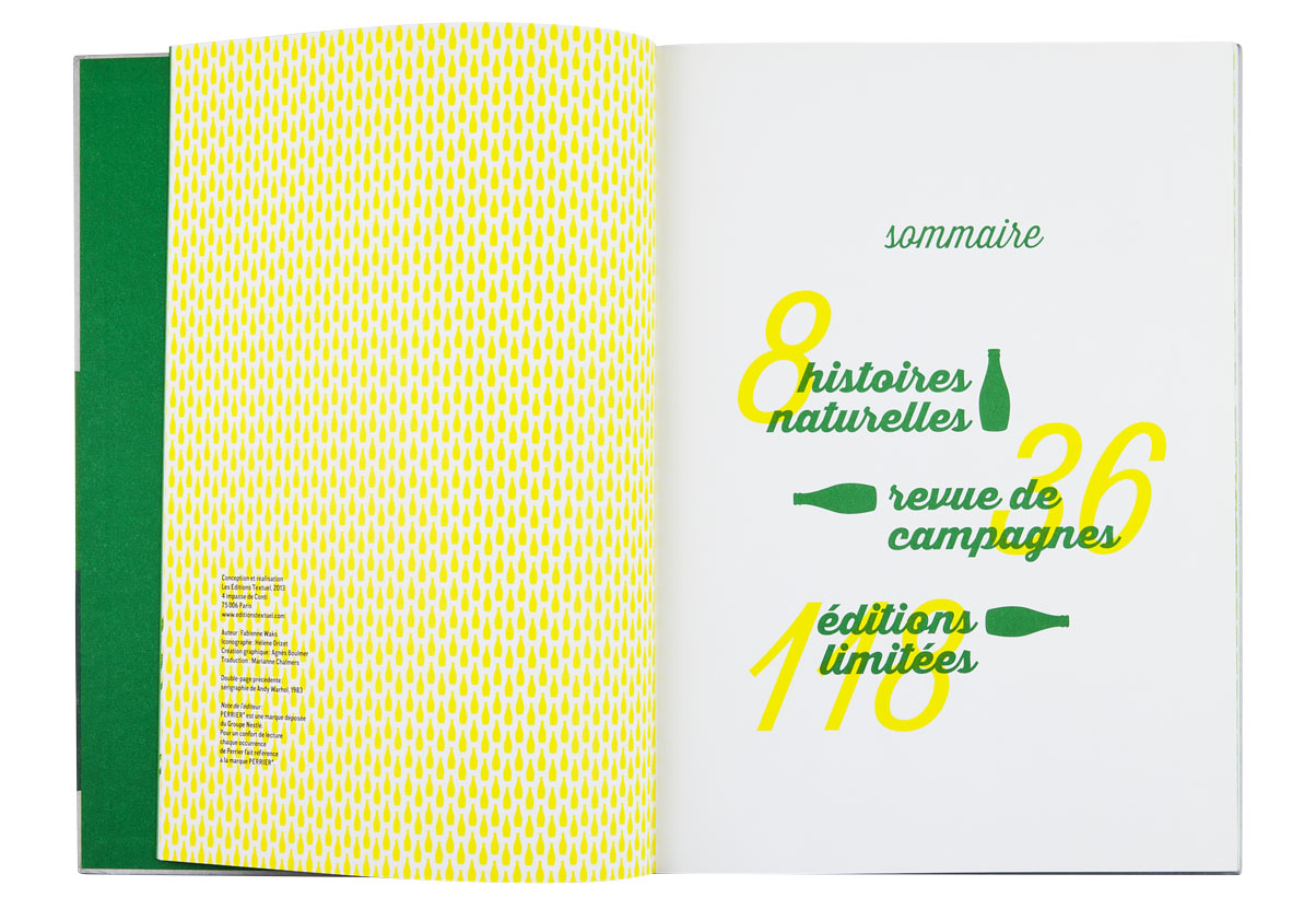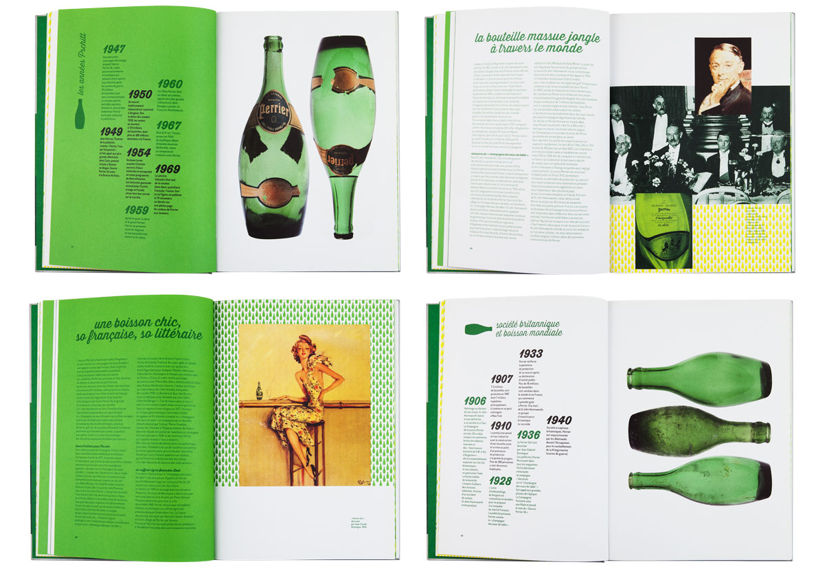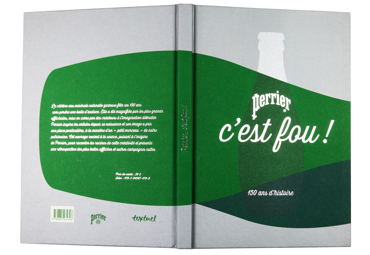 La célèbre eau gazeuse fête ses 150 ans. Elle a été magnifiée par les plus grands affichistes, mis en scène par des créateurs à l’imagination débridée. Cet ouvrage revient à la source, puisant à l’origine de Perrier pour raconter les racines de cette créativité et présente une rétrospective des plus belles affiches et autres campagnes cultes. Les slogans sont autant mis en valeur que les images de façon qu’au feuilletage, ils fonctionnent comme un “inventaire à la Prévert” plein d’humour et de poésie. Une frise de petites bouteilles à la forme si reconnaissable ponctue l’ensemble du livre et se décline, comme les pages, dans un dégradé de verts. L’ensemble créé un livre frais et ludique.